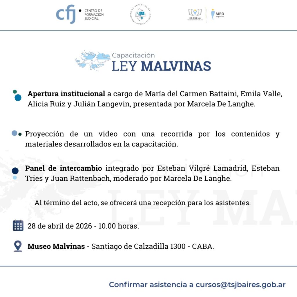 El Centro de Formación Judicial del Tribunal Superior de Justicia de la Ciudad Autónoma de Buenos Aires y el Instituto de Capacitación de las Provincias Argentinas y Ciudad Autónoma de Buenos Aires (REFLEJAR) tienen el agrado de invitarlo a participar del acto de presentación de la Capacitación obligatoria “Ley Malvinas”, elaborada en el marco de lo previsto en la Ley N° 27.671.