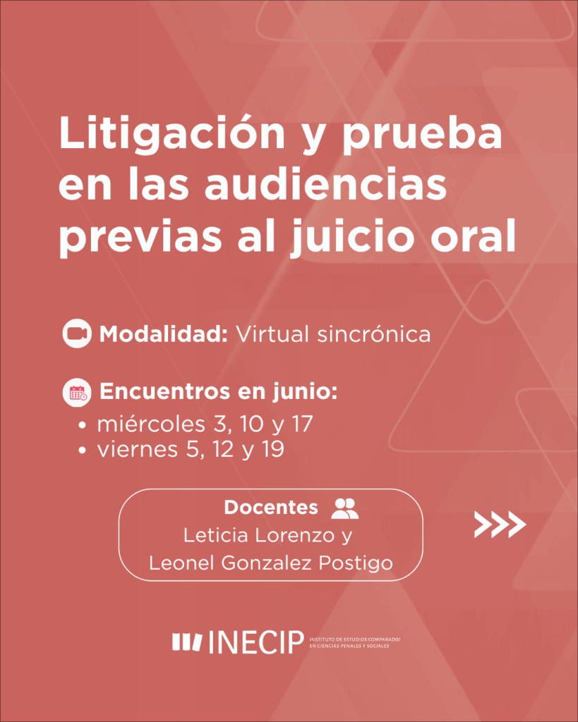 El Instituto de Estudios Comparados en Ciencias Penales y Sociales (INECIP) abre la inscripción al curso “Litigación y prueba en las audiencias previas al juicio oral”, que estará a cargo de Leticia Lorenzo y Leonel Gonzalez Postigo. El curso brinda herramientas concretas para planificar estratégicamente la intervención en las audiencias preliminares: cómo identificar el objeto de cada audiencia, cómo construir y anticipar argumentos, y cómo desempeñar con precisión el rol que le corresponde a cada parte en el litigio. Todo ello con un eje transversal en las dimensiones probatorias del proceso: los estándares de convicción exigibles en cada decisión, las reglas de exclusión como límite al poder punitivo y el manejo estratégico de la prueba desde las etapas más tempranas de la investigación. Modalidad: Virtual sincrónica Cursada: miércoles 3, 10 y 17 de junio // viernes 5, 12 y 19 de junio Horario: 18:00 a 20:00 Destinatarios: ▪️ Litigantes interesados en fortalecer sus habilidades en audiencias preliminares y profundizar el análisis estratégico de la prueba en el proceso penal adversarial. Docentes: ▪️ Leticia Lorenzo: Abogada (UBA). Jueza de Garantías del Colegio de Jueces del Interior (Poder Judicial del Neuquén). Maestranda en Derecho Penal y Procesal Penal (UNLPam). Diplomada en Estudios de Género (UTN). Profesora del Taller de Litigación de la Facultad de Ciencias Económicas y Jurídicas de la UNLPam. ▪️ Leonel Gonzalez Postigo: Abogado (UBA). Master en Derecho Penal y Procesal Penal por Osgoode Hall Law School (Universidad de York, Canadá), y Diplomado Latinoamericano sobre Reforma Procesal Penal por la Universidad Diego Portales (Chile). Doctorando en Derecho (UBA). Profesor de la Universidad Alberto Hurtado y Director de Relaciones Internacionales del INECIP. |