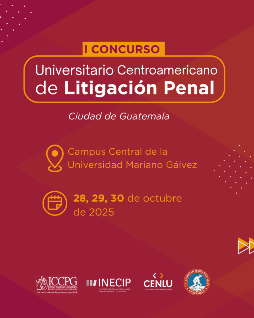 El Centro de Litigación Universitaria (CENLU) del Instituto de Estudios Comparados en Ciencias Penales y Sociales (INECIP), en conjunto con el Instituto de Estudios Comparados en Ciencias Penales (ICCPG) de Guatemala, invitan a presenciar la primera edición del Concurso Universitario Centroamericano de Litigación Penal, que se desarrollará del 28 al 30 de octubre de 2025 en la Universidad Mariano Gálvez, Ciudad de Guatemala.