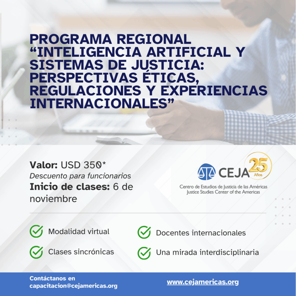 El Centro de Estudios de Justicia de las Américas (CEJA) invita a profesionales del derecho, la tecnología y la gestión pública a participar en el Programa Regional “Inteligencia Artificial y Sistemas de Justicia: Perspectivas Éticas, Regulaciones y Experiencias Internacionales”, una experiencia formativa que busca fortalecer la comprensión y el uso responsable de la IA en los sistemas judiciales.