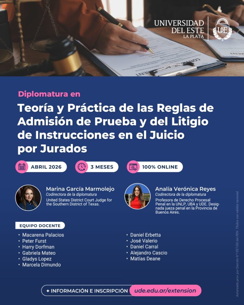Estimados/as debido al interés demostrado en la propuesta del curso de verano hemos planificado la DIPLOMATURA sobre en Teoría y Práctica de las Reglas de Admisión de Prueba y del Litigio de Instrucciones en el Juicio por Jurados organizada por el Programa de Extensión sobre Juicio por Jurados y Litigación de la Universidad del Este.